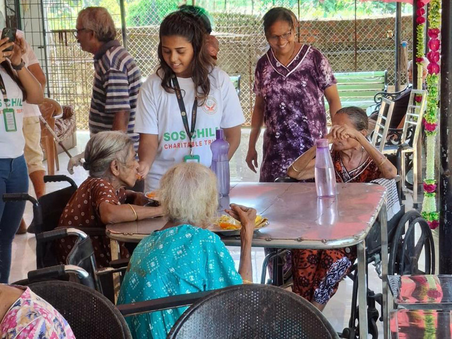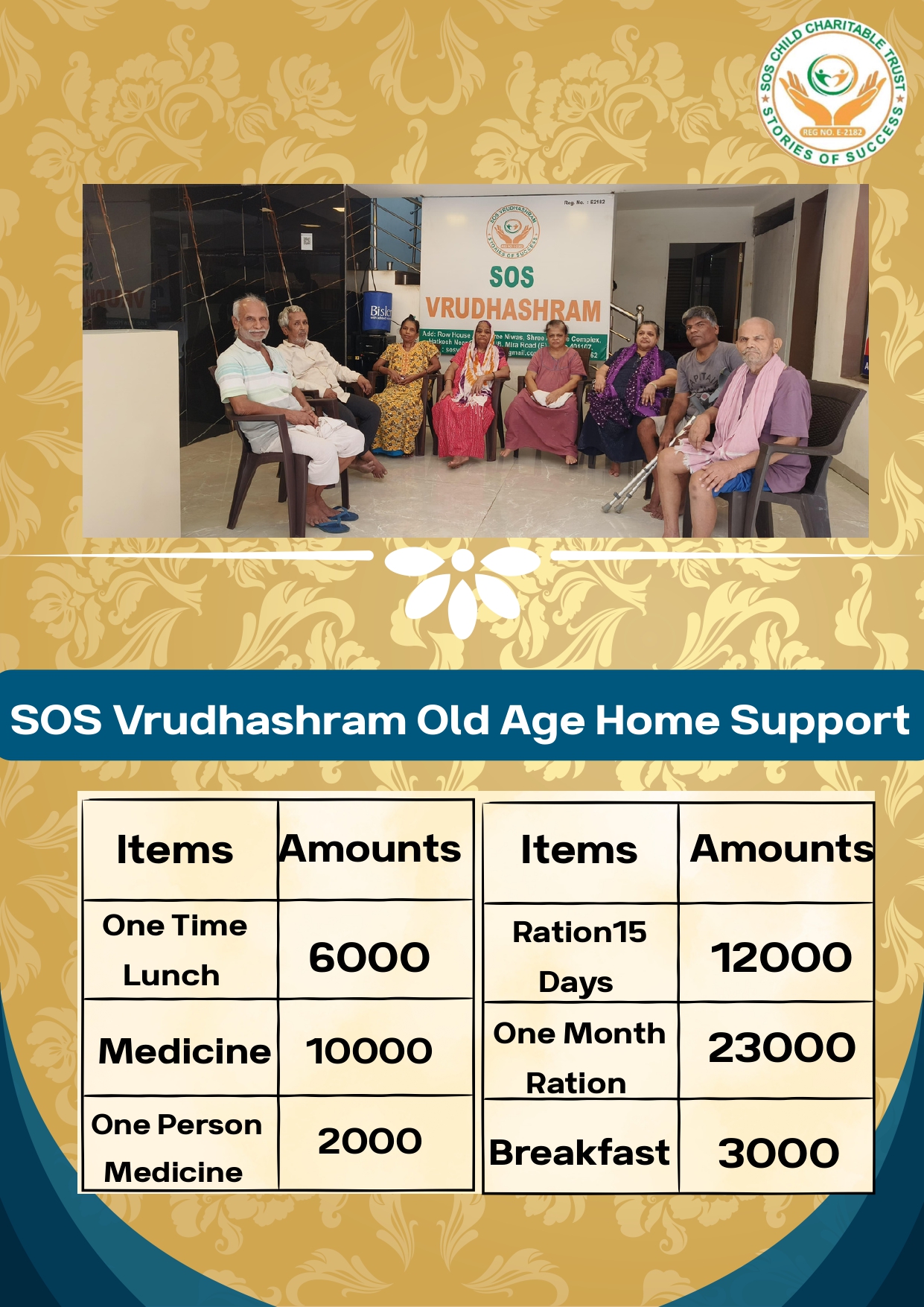 An old age home is usually the place a home for those old people who have no one to look after them or those who have been thrown out of their homes by their own children.The place is of course like home where the inmates get all the facilities for a routine living like food clothing medical and shelter. At least in India till now, the old people staying away from the home, from their children, or left to themselves is not considered to be a very happy situation.This concept of separating the elders from the youngsters has been imported into India from the West. It is very clear to all who visit an old age home that all the inmates are there, not for the love of being away from home and independent but because there is no better alternative left for them, once they are neglected and unwanted in their own homes by their own children.The only solace is that they are getting their daily requirements of shelter and food if not the bonds of love from the family. SOS CHILD CHARITABLE TRUST supports 45 senior citizens for their nutrition shelter medical and ensuring their physical mental spiritual and emotional well-being of each senior citizen’s.